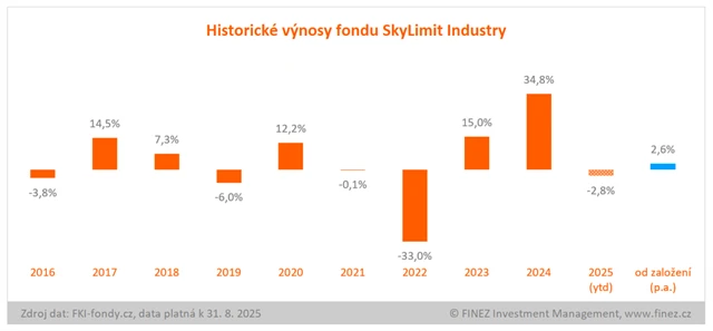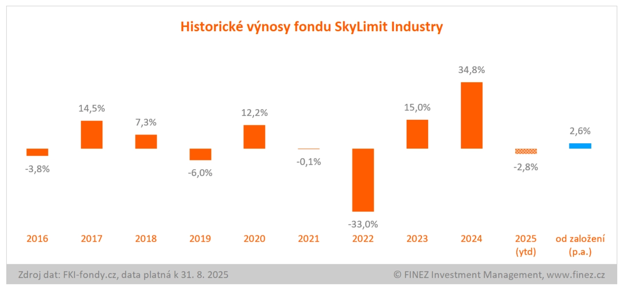 Fond SkyLimit Industry funguje už desátý rok. Jeho dosavadní výsledky jsou trochu jako horská dráha. Zejména roky 2021 a 2022 byly pro fond velice náročné. Sotva firmy nějak ustály pandemii, přišla válka na Ukrajině a energetická krize. V roce 2022 se dvě společnosti z pěti dostaly na hranu bankrotu a SkyLimit Industry tehdy vykázal ztrátu 33 %. Obě firmy ale přežily, a tak i samotný fond vykázal v letech 2023 a 2024 nadstandardní zhodnocení 15 %, respektive 35 %.
