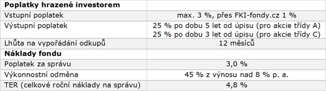 Úplata za obhospodařování, kterou strhává automatiky administrátor fondu z jeho majetku, je velice vysoká, konkrétně 3 % ročně. Celkový dopad ročních nákladů na správu fondu je vyčíslen na 4,8 %. Kromě toho je u fondu aplikována ještě výkonnostní odměna 45 % z výnosu přesahujícího 8 % ročně.
