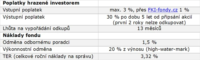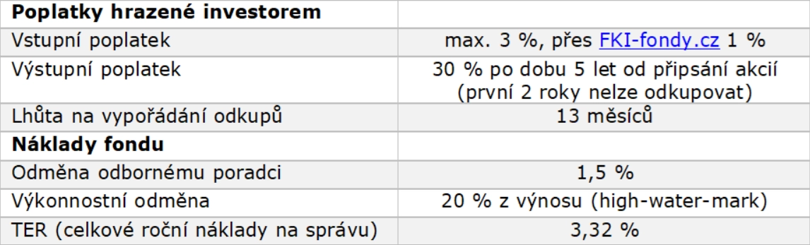 Výstupní poplatek 30 % je účtován při zpětném odkupu, pokud je doba mezi připsáním investičních akcií na majetkový účet investora a podáním žádosti o odkup delší než 24 kalendářních měsíců a zároveň kratší než 60 kalendářních měsíců. Po pěti letech od úpisu není výstupní poplatek aplikován. V prvních dvou letech fond zpětné odkupy neumožňuje.