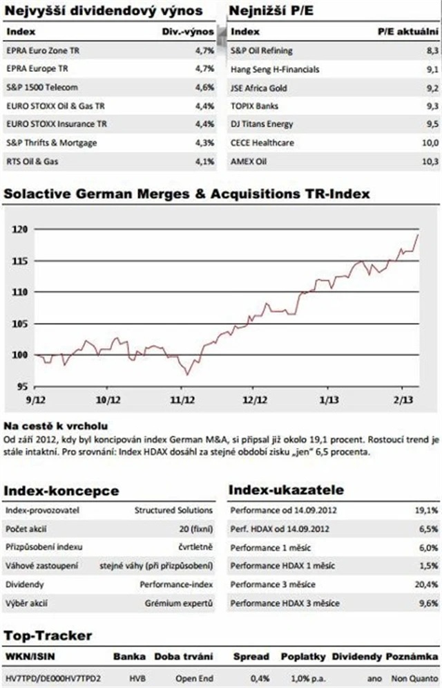 HypoVereinsbank onemarkets na trend akvizic reagovala již na podzim 2012 a ve spolupráci se společností Structured Solutions vytvořila nový index Mergers & Acqusitions, který se zaměřuje výhradně na německý trh. Do tohoto indexu vybírají odborníci každé čtvrtletí 20 společností – potenciálních kandidátů na akvizici, které mají pak v indexu stejnou váhu. Tímto je téměř vyloučeno riziko koncentrace.