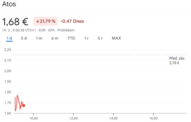 Akcie Atosu na úterní oznámení Airbusu zareagovaly mohutným propadem. Krátce po začátku obchodování na pařížské burze odepisovaly až 25 procent a dostaly se na 1,62 eura. Před rokem stály téměř 15 eur.