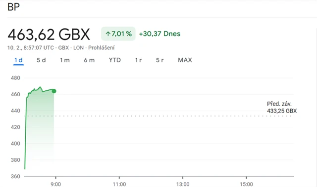 Krátce po otevření londýnské burzy posilovaly akcie BP o 7,14 %.