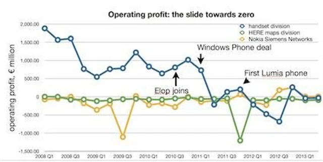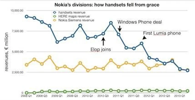 Trend tržeb divize mobilních telefonů je zřetelný - neustále klesající tržby od roku 2002. Nezměnilo ho ani zahájení prodejů zařízení Windows Phone ve čtvrtém čtvrtletí 2011.