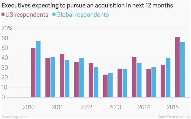 Podle zprávy nazvané Barometr světové kapitálové důvěry zvažuje nějakou akvizici v následujících 12 měsících 61 % amerických a 56 % světových firem. 95 % amerických firem navíc podle EY říká, že budou na poli akvizic aktivnější než v předchozích 12 měsících, zatímco ve světě tento pohled sdílí jen si 47 % firem.