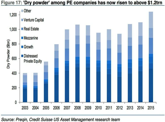 Ne všechny peníze budou samozřejmě využity na M&A. Garthwaite se tento objem peněz ale pokouší odhadnout. "Naše konzervativní odhady se pohybují okolo 4,2 bilionu USD, což je asi desetina globální tržní kapitalizace veřejně obchodovaných firem. Jde o hotovost firem, refinancování úvěrů a private equity," píše stratég. Na private equity má přitom podle společnosti Preqin připadat právě 1,2 bilionu amerických dolarů.