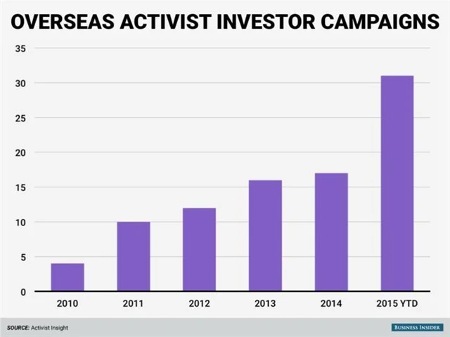 Jedním z řešení pro aktivisty hledající jedinečné cíle je začít se pídit po nových příležitostech v zahraničí. Podle všeho k tomu již dochází. Počet mezinárodních aktivistických kampaní roste od roku 2010. V roce 2015 zatím aktivističtí investoři zacílili na zahraniční společnosti 31krát. Jde o rekordní rok, protože, jak naznačují data Activist Insight, loni k tomu došlo jen 17krát.