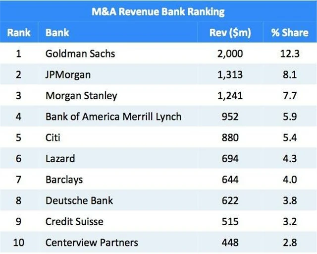 Banka Goldman Sachs letos v oblasti fúzí a akvizic nemá na světě konkurenta, zejména co se týče příjmů z poplatků.