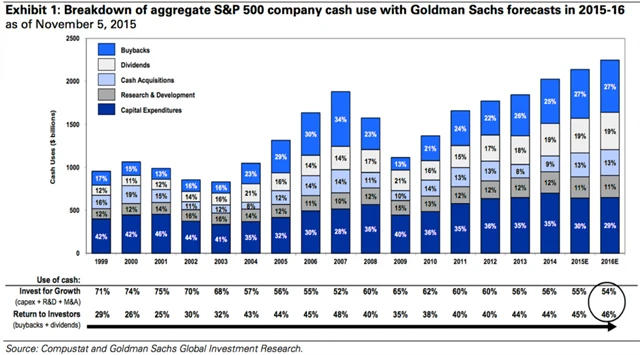 Goldman Sachs tvrdí, že společnosti navzdory rostoucím valuacím utratí v roce 2016 za vlastní akcie 608 miliard USD. "I přes slabší první polovinu roku 2015 by měla aktivita zpětných odkupů zůstat silná. Po 9% růstu v roce 2014 a očekávaném 10% růstu v roce 2015 lze předpokládat, že zpětné odkupy firem z S&P 500 příští rok vzrostou o dalších 7 % na 608 miliard USD. V současnosti je zapojeno do programů zpětných odkupů zhruba 80 % společností z S&P 500, což je dvojnásobek oproti podílu firem, které zpětné odkupy praktikovaly před 20 lety."