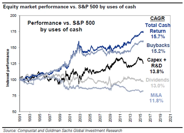 I když Goldman Sachs všeobecně brojí proti masivním zpětným odkupům, její analytici doporučují investorům nakupovat společnosti, které vracejí hodně hotovosti akcionářům v poměru k reinvesticím, protože se tato strategie v současném makroekonomickém prostředí vyplácí (pomalý růst HDP a nízké úroky vedou ke slabým kapitálovým výnosům akcií).