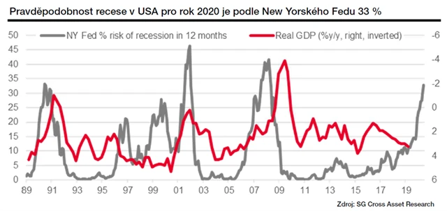 Trh předpokládá, že v ročním horizontu dojde dokonce k trojímu snížení úrokových sazeb v USA. Každý tento krok by měl být o čtvrt procentního bodu. Obdobná očekávání jsme na trzích pozorovali v 90. letech, konkrétně v letech 1995 a 1998. Recese tehdy ovšem nenastaly.