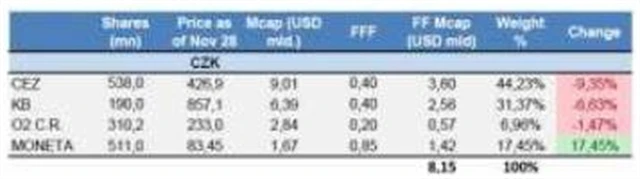 "Úprav se za necelé tři týdny dočká také index PX. Pravidelné čtvrtletní rebalancování indexu je naplánováno na 19. prosince, parametry ovlivňující nastavení vah jednotlivých titulů budou ale oznámeny již ve čtvrtek. Na základě našich výpočtů by mělo dojít pouze k minimálním změnám směrem dolů u cenných papírů Erste, ČEZ a Komerční banky. O čtyři až pět procentních bodů by se naopak měla zvýšit váha akcií Monety," říká analytik České spořitelny Pavel Smolík.