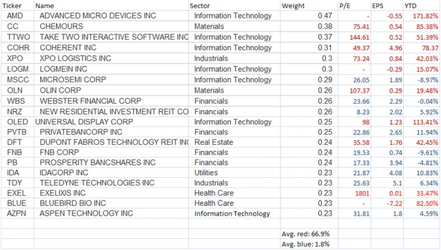 Ukazatel P/E (poměr ceny k zisku na akcii) indexu Russell 2000 se pohybuje kolem 82, v případě indexu S&P 500 je to "jen" 24. A teď to přijde. Mezi 20 největšími pozicemi fondu iShares Russell 2000 jsou tři akcie se záporným EPS a dále 11 akcií s P/E vyšším než 30, z toho osm akcií s P/E vyšším než 70. Akcie s P/E vyšším než 30 od začátku letošního roku zpevnily v průměru o přibližně 70 %, zatímco akcie s P/E nižším než 30 stouply jen o necelá dvě procenta.