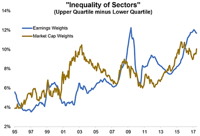 K podobnému extrému jako v době technologické bubliny je sice ještě daleko, ale rozdíly se zvětšují a trh se dostává do podobného stavu, v jakém byl před poslední finanční krizí. Na grafu je patrný rostoucí rozdíl v kapitalizaci a výnosech sektorů v nejlepším a nejhorším kvartilu. Tento trend se v posledních letech rychle zvýrazňuje.