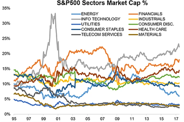 V rámci indexu S&P 500 došlo v posledních 20 letech k poměrně velkému rozkolu mezi sektory, a to jak v oblasti tržní kapitalizace, tak v oblasti příjmů, respektive zisků, jimiž jednotlivá odvětví přispívají celému benchmarku.