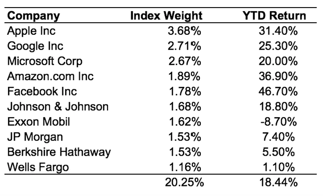 Zejména letos je to poměrně zvláštní, když největší zhodnocení zaznamenávají největší tituly, jako jsou Apple, Facebook, Amazon, Microsoft nebo Alphabet. Průměrný výnos deseti největších titulů v indexu S&P 500 byl k 20. červenci bezmála 19 %, přičemž výnos celého indexu byl okolo 11 %.