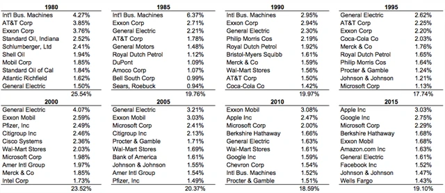 - Společnosti General Electric se jako jediné podařilo být v desítce největších v obdobích od roku 1980 až do roku 2015. Nic však netrvá věčně, dnes již do TOP 10 nepatří.