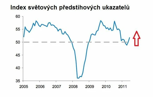 Investoři se v současné době již nebojí další dluhové nákazy v Evropě. Inflace je po celém světě zanedbatelná a po strašidelných scénářích budoucího vývoje ekonomiky, kterých byly v minulém roce plné noviny, se zdá, že globální ekonomická data naznačují solidní oživení. Ilustruje to například graf světových předstihových ukazatelů.