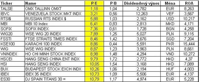 V první tabulce je zobrazeno 15 indexů s nejnižším ukazatelem P/E. Obecně jsou považovány indexy s nižším ukazatelem za "levnější". Nejnižší hodnotu má aktuálně estonský akciový index. Na druhém místě jsou akcie Venezuely, dále Ruska, Makedonie, Bulharska a Polska. V tabulce najdeme i egyptské či vietnamské akcie.
