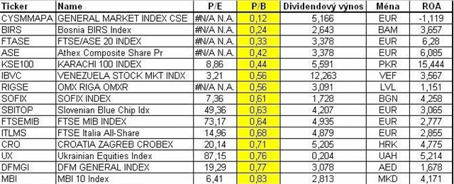 V druhé tabulce jsou akcie seřazené podle ukazatele P/B. I v tomto případě jsou považovány akcie s nižším ukazatelem za "levnější". Pozorný čtenář zjistí, že některé indexy z první tabulky se objevují i zde. "Nejlevnější" jsou akcie na Kypru, dále v Bosně, Řecku, Egyptě, Venezuele nebo Lotyšsku.