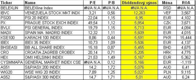 V další tabulce jsou seřazeny akcie podle dividendového výnosu. Čím vyšší je ukazatel, tím "lépe". Nejvyšší má venezuelský akciový index, dále pak portugalský, český, španělský nebo egyptský.