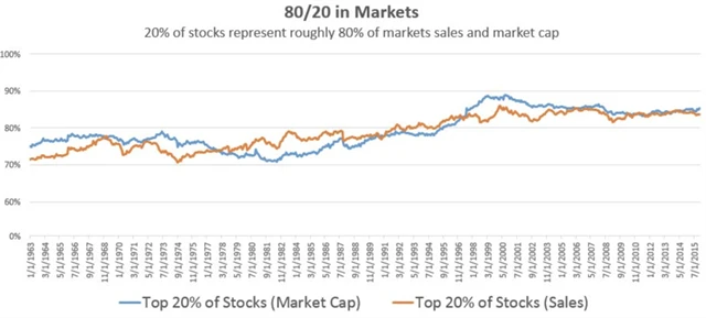 Aby ale bylo jasno, nerovnováha ve velikostech tržních kapitalizací firem v S&P 500 není žádnou novodobou záležitostí. Dlouhodobě platí, že 75-85 % market capu S&P 500 zajišťuje jen zhruba 20 % společností.