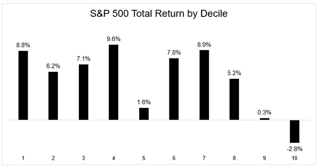 Následující graf ukazuje, jaké byly od začátku letošního roku průměrné výnosy akcií různě velkých společností z S&P 500. V prvním decilu jsou akcie 50 největších firem, v desátém naopak akcie 50 nejmenších firem. Například akcie společností ze čtvrtého a sedmého decilu jsou na tom dokonce lépe než akcie 50 největších podniků.