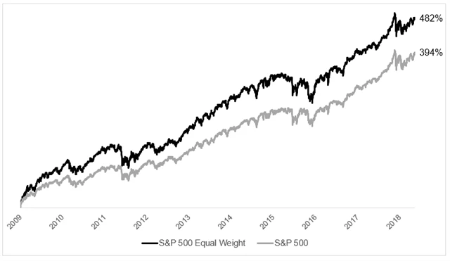 Skutečnost, že výrazná nadváha malého počtu akcií není až tak velkým problémem, jak se často říká, potvrzuje i následující graf, který ukazuje, že od roku 2009 je dokonce výkonnost indexu S&P 500, v němž mají akcie všech společností stejnou váhu, lepší než výkonnost klasického S&P 500, v němž je váha akcií určována velikostí tržní kapitalizace firem.