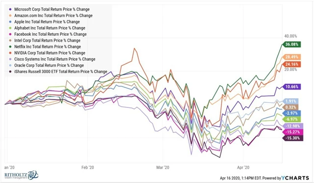 Amazon, Netflix nebo Microsoft těží z restriktivních opatření a růstu počtu lidí, kteří pracují z domova. Nelze samozřejmě odhadovat, zda si jejich akcie růstové momentum udrží dlouhodobě. Skutečnost, že velkou část trhu reprezentují právě velké růstové tituly, ale mimo jiné znamená, že aby se celý trh propadl třeba o 40 % při propadu cen akcií největších technologických firem o 24 %, musel by zbytek trhu spadnout o více než 50 %.