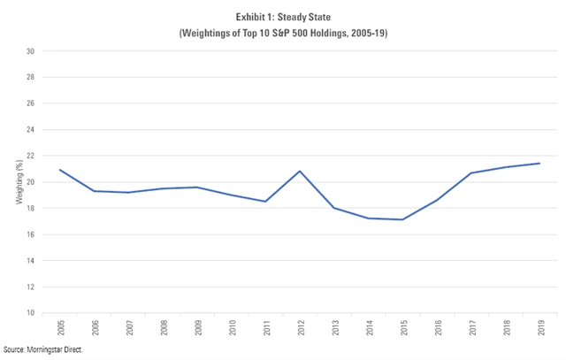 První graf ukazuje vývoj váhy deseti největších firem v indexu S&P 500 mezi roky 2005 a 2019. Donedávna se křivka vyvíjela víceméně do strany.