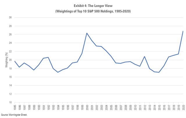 Podíl nejtěžších vah v S&P 500 se dokonce dostal nad úroveň z přelomu tisíciletí, tedy doby, kdy na Wall Street vrcholila technologická bublina.