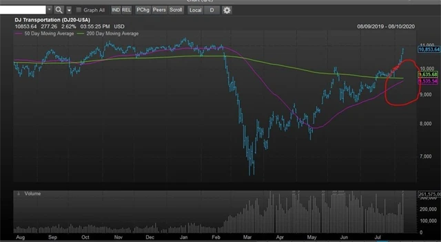 Index DJTA, který sleduje dvacet amerických společností působících v letecké, železniční, nákladní a lodní dopravě a přepravě, se po výrazných propadech na začátku letošního roku sice ještě nedostal na letošní maximum, ale 50denní klouzavý průměr se již přiblížil k 200dennímu a v nejbližších dnech jej protne.