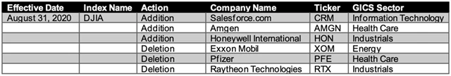Budou proto vyměněny hned tři tituly - salesforce.com (v pondělním after-marketu +3,9 %) nahradí firmu ExxonMobil (-2,0 %), Amgen (+4,2 %) bude nově zařazen namísto Pfizeru (-1,7 %) a Honeywell International (+3,5 %) bude v Dow místo akcií Raytheon Technologies (-3,0 %).