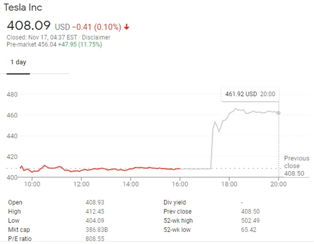 Akcie firmy v reakci stouply o 12 %. Tesla je díky své tržní hodnotě téměř 387 miliard dolarů (která nejspíše v úterním řádném obchodování výrazně vzroste) nejdráže obchodovanou automobilkou světa a s ohledem na letošní růst ceny jejích akcií se o začlenění podniku do S&P 500 již dlouho spekulovalo.