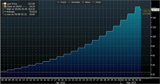 Exponenciální růst ceny akcií společnosti Baofeng dělá z titulu nejvýkonnější čínský titul. Financial Times tvrdí, že každá z 29 primárních nabídek akcií (IPO) v Šanghaji nebo Šen-čenu v posledním měsíci rostla každý den o maximální limit. Indexy v Číně letos zatím posilují o 30 %, bylo to již i téměř 40 %.