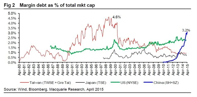 Těžko říci, zda se tak opravdu nakonec stane (banky nemají neomezenou úvěrovou kapacitu a vláda už zakotvila do zákonů limity na maržové úvěrování). S 3,2 % celkové tržní kapitalizace ale již čínské půjčky na nákupy akcií (margin debt) pokořily hodnoty z éry bubliny v Japonsku i období před asijskou krizí v Jižní Koreji.