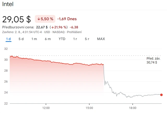 Intel vykázal čtvrtletní ztrátu 1,6 miliardy USD, zruší 17 500 míst. Akcie firmy odepsaly v předobchodní fázi přes 20 %