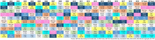 Přehled výkonnosti jednotlivých tříd aktiv od roku 2000 také potvrzuje, že základním stavebním kamenem každého portfolia by měla být široká diverzifikace. Třeba v roce 2008 byly dluhopisy vedle hotovosti jedinou standardní třídou aktiv, která skončila v plusu. Akcie firem s velkou tržní kapitalizací tehdy spadly o 37 % a například akcie firem na rozvíjejících se trzích se zřítily o více než 53 %.