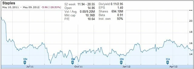 Největší světový producent kancelářských potřeb s 25miliardovými tržbami a více než 2 000 obchody v 25 zemích. Analytici očekávají, že za fiskální rok vydělá 1,50 USD na akcii a příští rok EPS naroste o 9 % na 1,63 USD. S&P společnost hodnotí "buy" s cílem 20 USD.