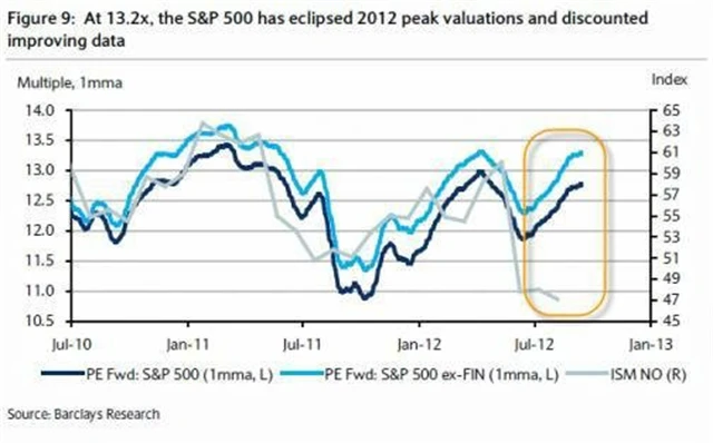 Nesoulad mezi ekonomickým cyklem a posilujícím americkým akciovým trhem je stále markantnější. Následující tři grafy ilustrují, jak velké naděje jsou nyní započteny v cenách akcií. Investoři věří v úspěšnou výsledkovou sezónu, oživení světové ekonomiky nebo v to, že američtí politici (možná jako obvykle až za pět minut dvanáct) zabrání fiskálnímu útesu, z něhož se má americká ekonomika zřítit začátkem roku 2013.