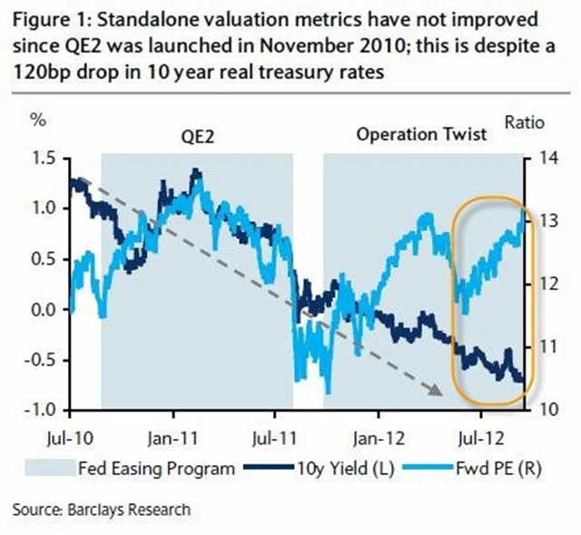 V Barclays jsou daleko méně optimističtí, než bývali touto dobou v uplynulých dvou letech. Investoři mají zřejmě špatnou paměť. Monetární politika nebyla v případě minulých rally, které následovaly po QE2 a operaci Twist, hlavním tahounem akciového růstu. V období předcházejícím QE2 a bezprostředně po jeho spuštění byly ekonomický i politický výhled lepší než dnes.
