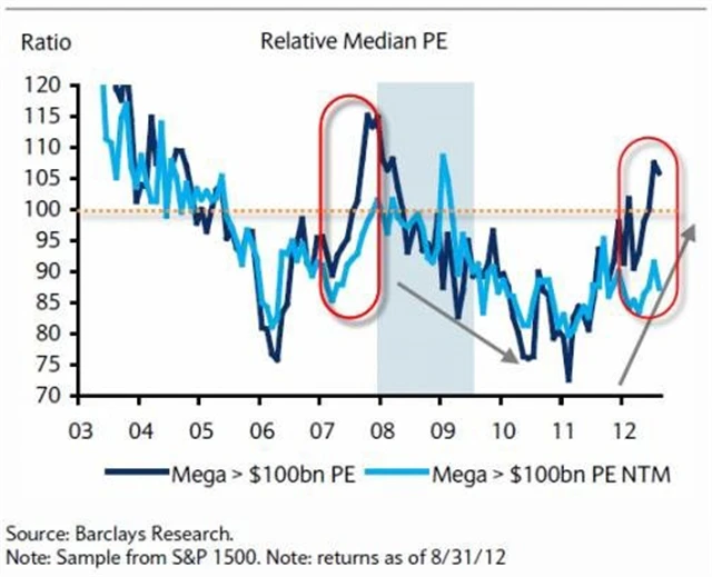 Mega-caps dominující hlavním indexům, které všichni bedlivě sledujeme (včetně Bena Bernankeho), jsou nadhodnocené ve vztahu k méně defenzivním akciím. Ponechávají spoustu prostoru pro tržní fázi risk-off.