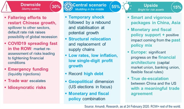 Jako nejpravděpodobnější se jeví dočasné zhoršení globálního hospodářského vývoje v prvním čtvrtletí s možným přelitím problémů do čtvrtletí druhého. V druhém pololetí by ale měly být případné škody napraveny, námi zkraje roku očekávané oživení by se tedy mělo jen posunout. Tento základní scénář ve svém výhledu z konce února vyhlížejí experti ze společnosti Amundi. Jaký by podle nich mohl být vývoj na trzích a v ekonomice v dalších scénářích?