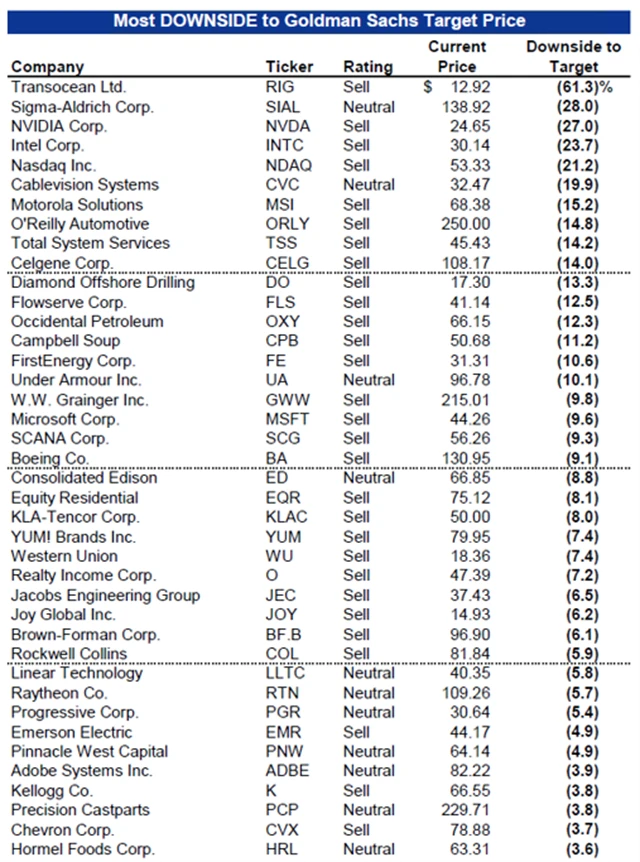 A tým Davida Kostina ukazuje i na 40 titulů, které jsou podle Goldman Sachs naopak aktuálně nejvíce nadhodnocené. K nejznámějším krajně nedoporučovaným akciím byly zařazeny například Microsoft nebo Yum! Brands.