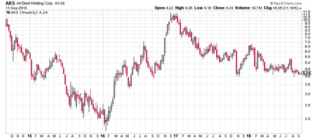 Akcie ocelářské firmy s tržní kapitalizací 1,3 miliardy dolarů se obchodují lehce nad 4 dolary, což je daleko od lednového maxima na 6,65 dolaru, takže potenciál růstu titul nabízí. Akcie ocelářských firem, jako jsou AK Steel, Nucor a US Steel, jsou ale poměrně volatilní. Obchodní válka a časté změny cel vytvářejí nejisté prostředí, zároveň ale znamenají omezení vlivu Číny na trh s ocelí a růst cen v USA, které jsou na sedmiletém maximu.