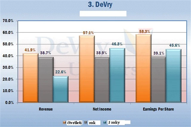 V číslech: Za třetí kvartál se podařilo společnosti DeVry navýšit zisk o 57 procent na 55 milionů dolarů. Tržby vyrostly o celých 42 procent na 431 milionů dolarů.