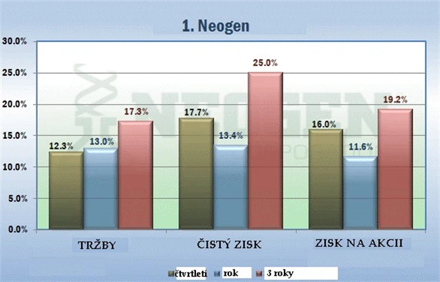 Prodejce bezpečnostních potravinových testůV číslech: Za třetí čtvrtletí zaznamenala společnost Neogen růst čistého zisku o 18 procent na 4,4 milionu dolarů. Tržby se vyšplhaly o 12 procent na 32 milionů dolarů. Společnost má výhodnou pozici na trhu především díky 24 milionům dolarů v hotovosti a nulovým dluhům.