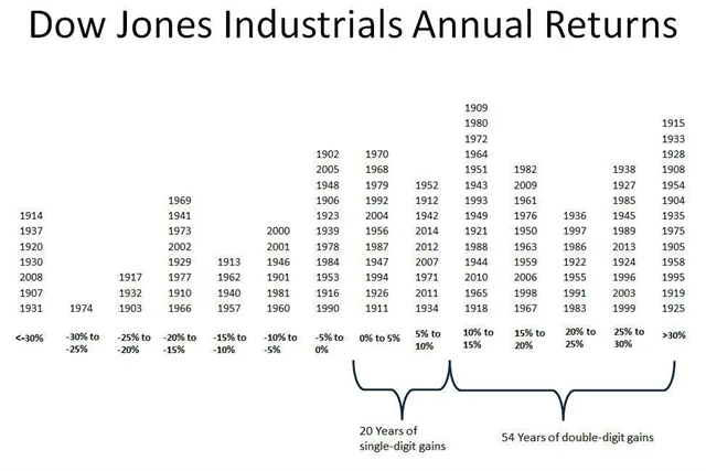 - Dvojciferné výnosy jsou normální, nejsou výjimkou. U Dow jsou téměř třikrát častější než jednociferné.