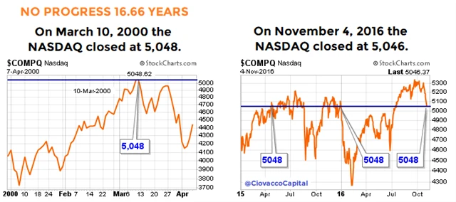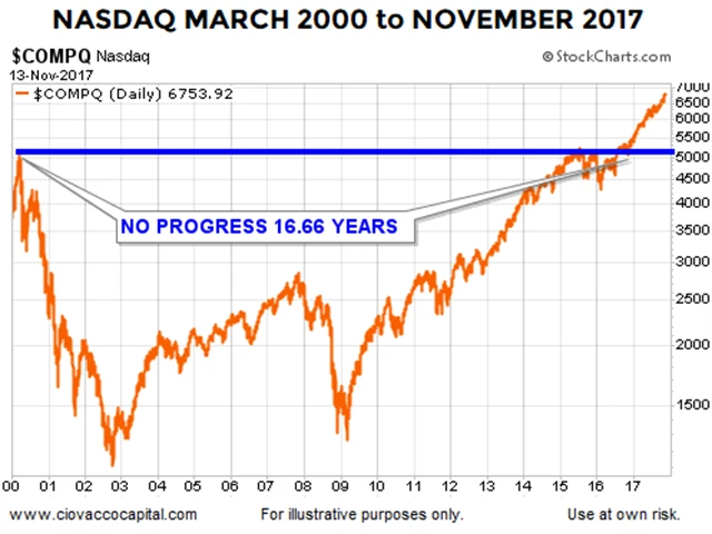 Řekneme-li, že uvedený argument je kontraintuitivní, je to ten nejlepší kompliment, jaký mu lze složit. Představte si, že vylezete na gruzínskou horu Džangi-Tau, která měří 5 051 metrů, slezete skoro čtyři tisíce metrů do údolí a pak zase vyběhnete vedle na vrcholek ledovce Šchara do výšky 5 193 metrů. Číselně vzato provedl Nasdaq Composite zhruba totéž. A teď si poslechněte od nějakého chytrolína, že poněvadž jste před týdnem byli na prvním vrcholku, vlastně jste nic neušli.