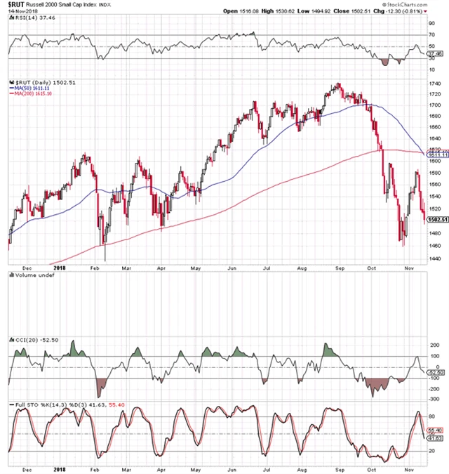 U indexu Russell 2000 se cena propadla pod 50denní klouzavý průměr, přičemž se kromě nižšího vrcholu objevil také kříž smrti (50denní průměr se dostal pod 200denní), což je silný medvědí signál.