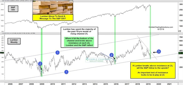 "V posledních dvou případech, kdy se cena dřeva odrazila od spodní hrany růstového kanálu a prorazila i linii krátkodobého sestupného trendu (v grafu označeno číslovkou 2), šlo o býčí signál nejen pro dřevo, ale i pro americké akcie," poznamenal v týdnu expert na sexy grafy Chris Kimble, který si dokonce umí přilepšit díky své společnosti Kimble Charting Solutions.